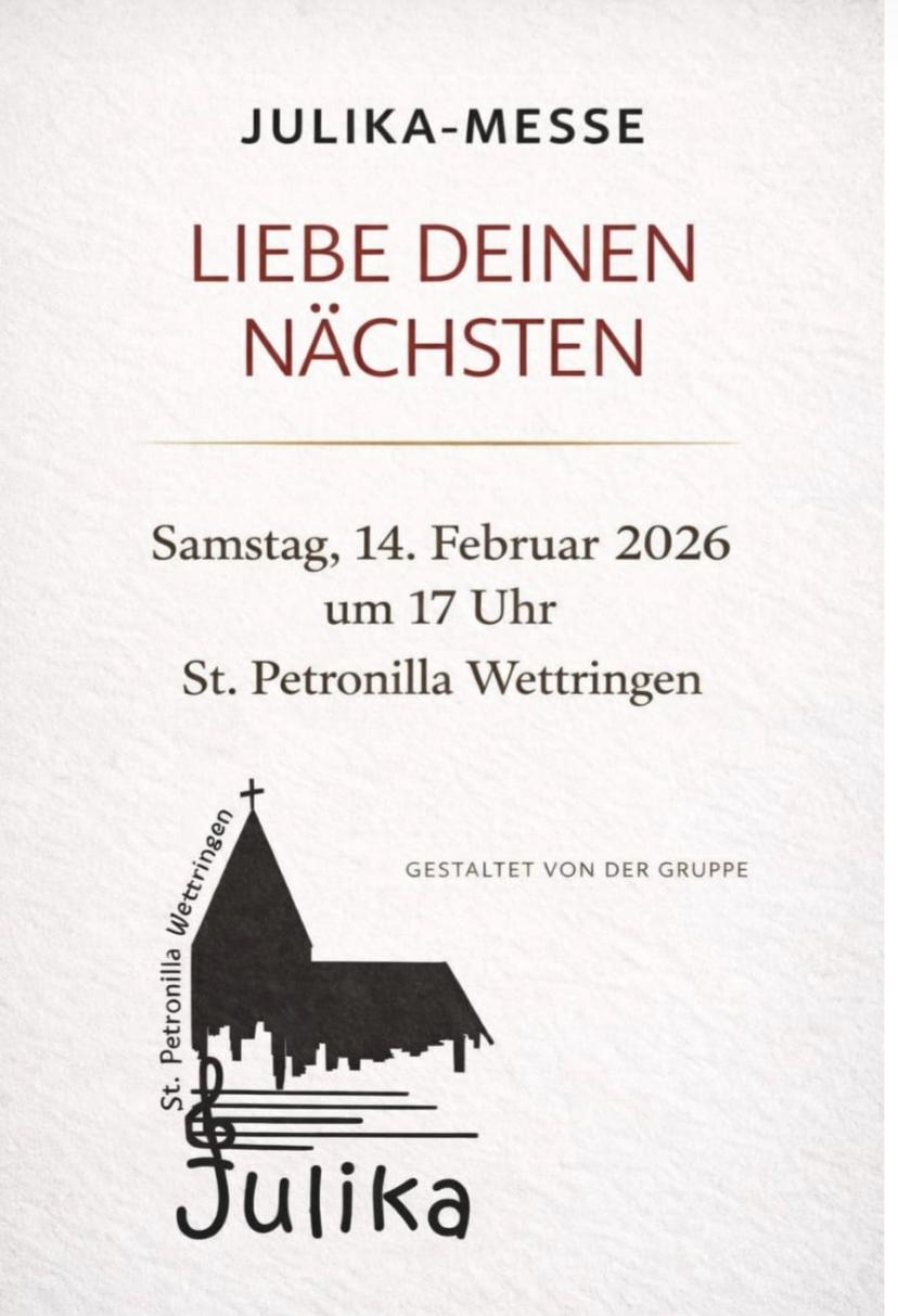 Herzliche Einladung zur Julika-Messe am Samstag, 14. Februar 2026 um 17 Uhr in St. Petronilla Wettringen. Unter dem Leitwort „Liebe deinen Nächsten“ möchten wir gemeinsam innehalten, zuhören, singen und Gemeinschaft erleben. Gestaltet von der Gruppe Julika freuen wir uns auf einen besonderen Gottesdienst, der Herz und Seele berührt.