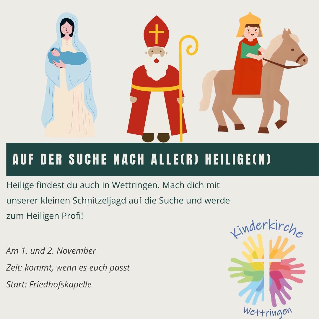 Die nächste Kinderkirche findet als offenes Angebot am Allerheiligen Wochenende statt. Auch in Wettringen findet man Heilige. „Auf der Suche nach Alle(r) Heilige(n)“ können sich Familien am 1. und 2. November an verschiedenen Stationen in Wettringen machen. An jeder Station erfahren Kinder etwas über Heilige in unserem Ort. Startpunkt ist die Friedhofskapelle auf dem Wettringer Friedhof. Eingeladen sind alle kleinen und Großen Interessierten.